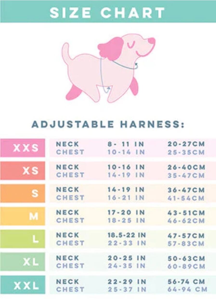 カラフルでハッピーな CARE BEARS™ デザインが魅力の、機能性と快適さを兼ね備えたアジャスタブルドッグハーネスです。